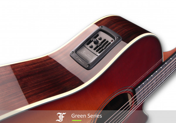 The Furch Green Master’s Choice model is a high-quality all-solid-woods guitar in the Dreadnought shape with cutaway. The guitar features carefully selected tonewoods – the soundboard is made from Sitka spruce, and the back and sides from Indian rosewood. The body is protected by Furch’s proprietary Full-Pore High-Gloss Finish. The sunburst option is available for the soundboard. The combination of tonewoods and finish lends the instrument a stylish appearance underscored by fine walnut and ivory appointments. The guitar produces a rich sound with ringing highs and a fine balance across the entire tonal spectrum.